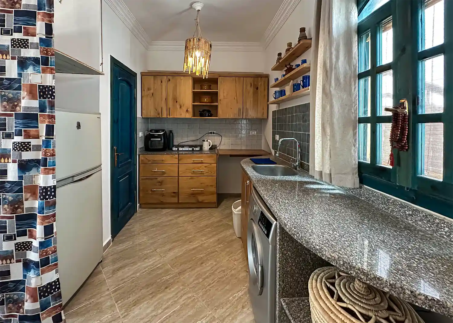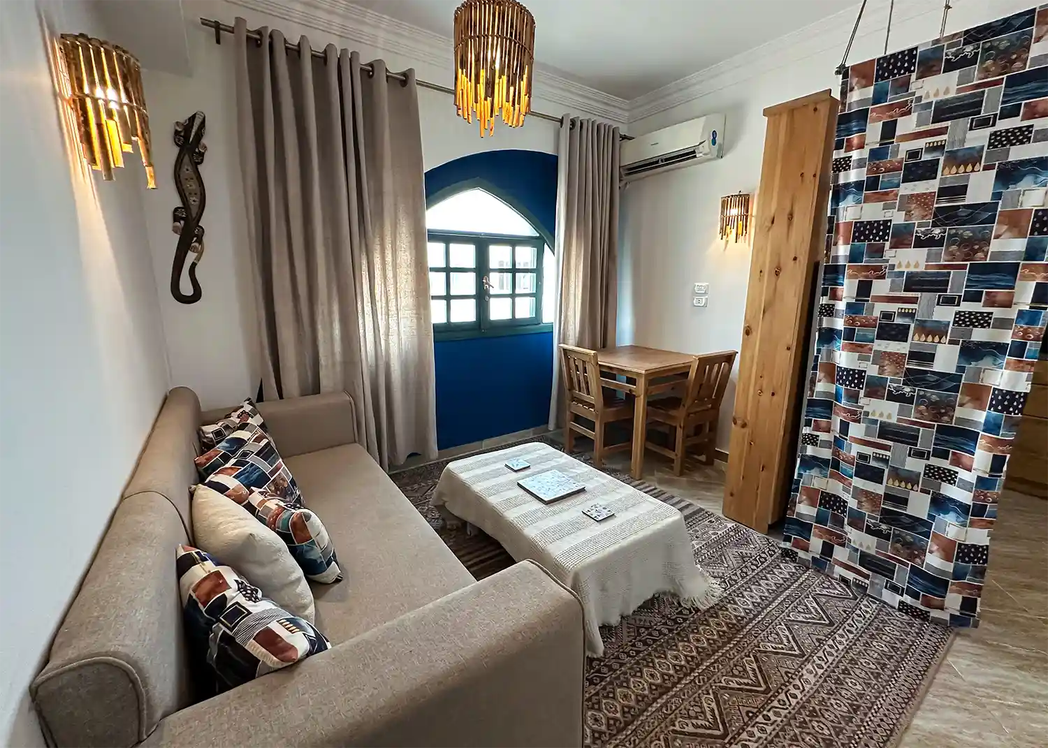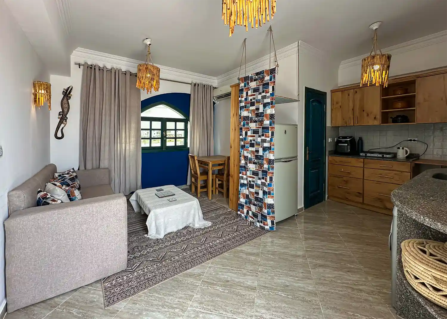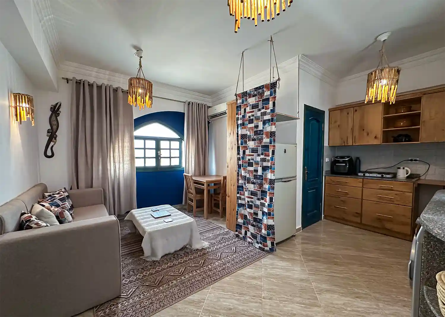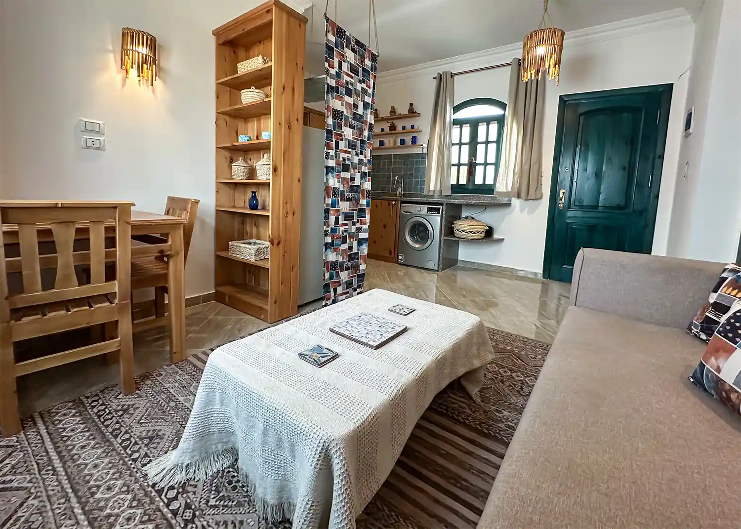 This sweet one bedroom apartment is thoughtfully decorated and has everything needed for a comfortable stay in Dahab including a 4 hob gas cooker, gas oven, washing machine, fridge freezer, kitchen basics and Ac’s in both the living space and the bedroom.