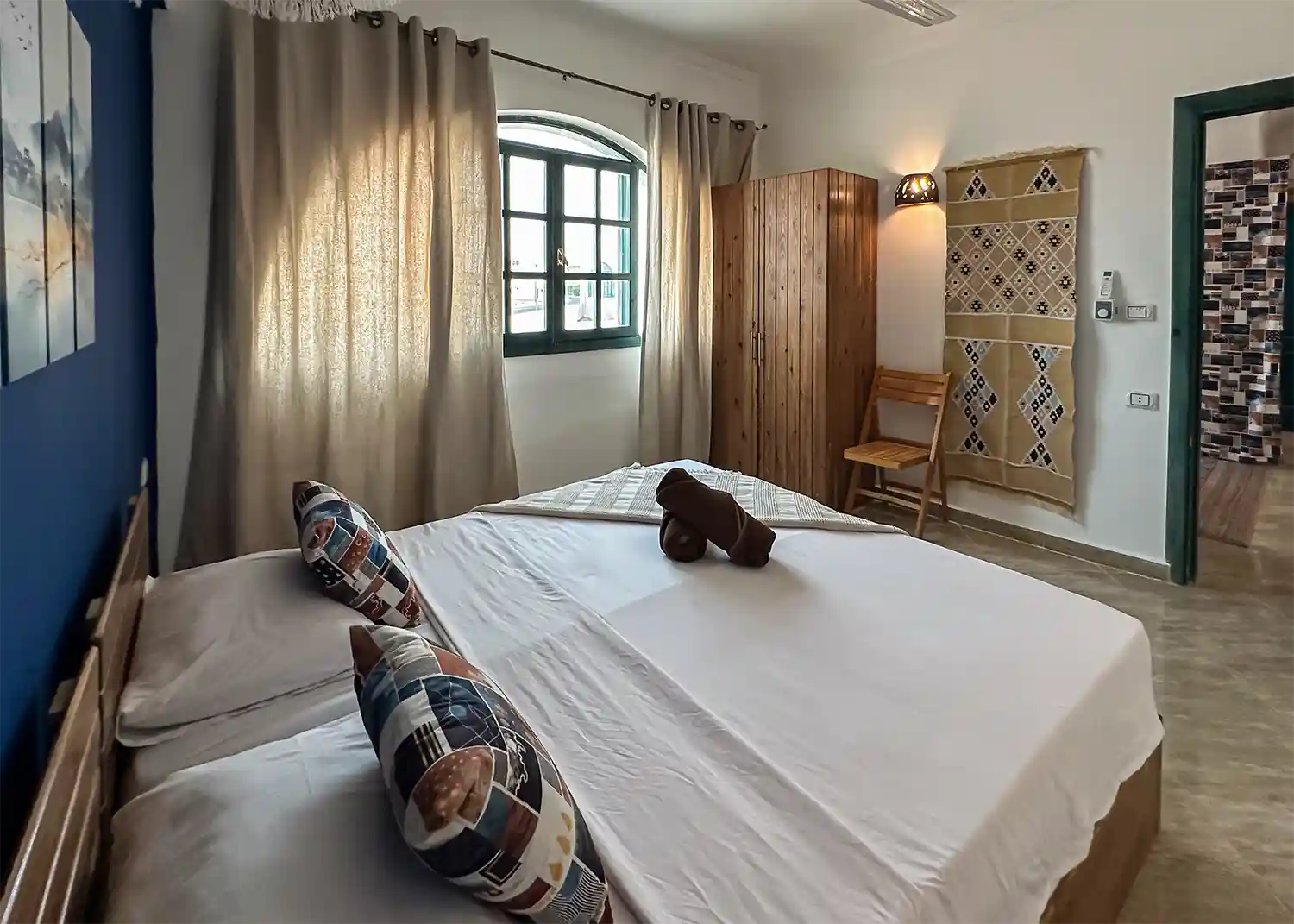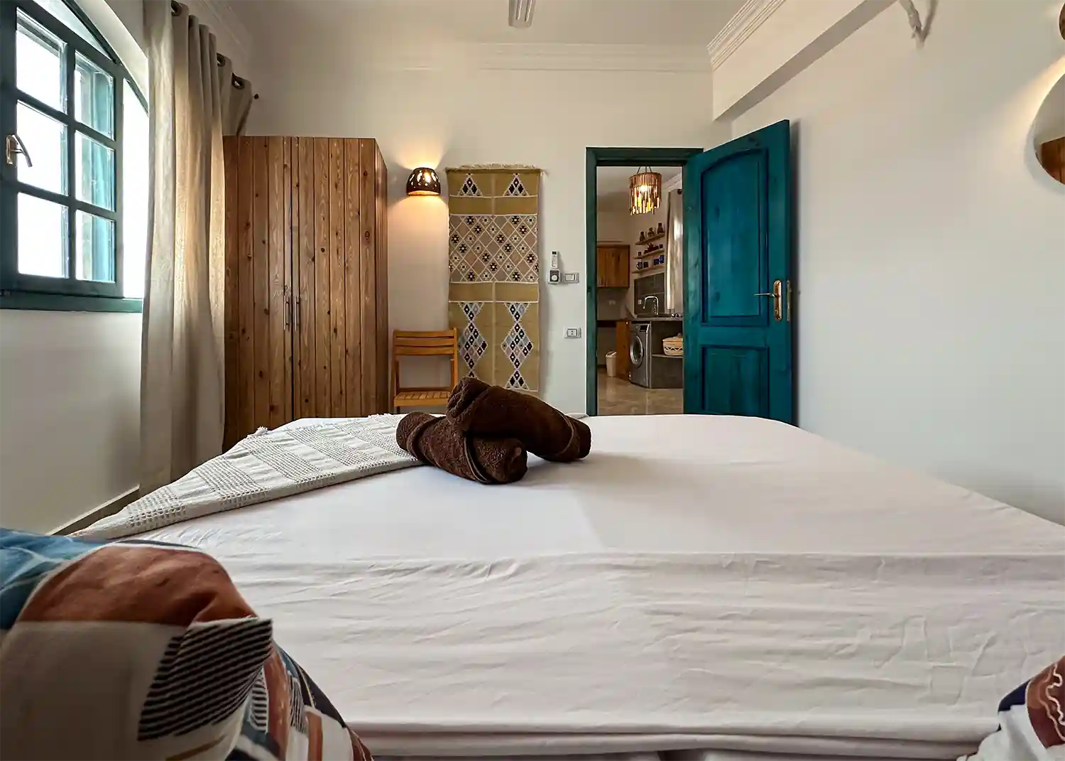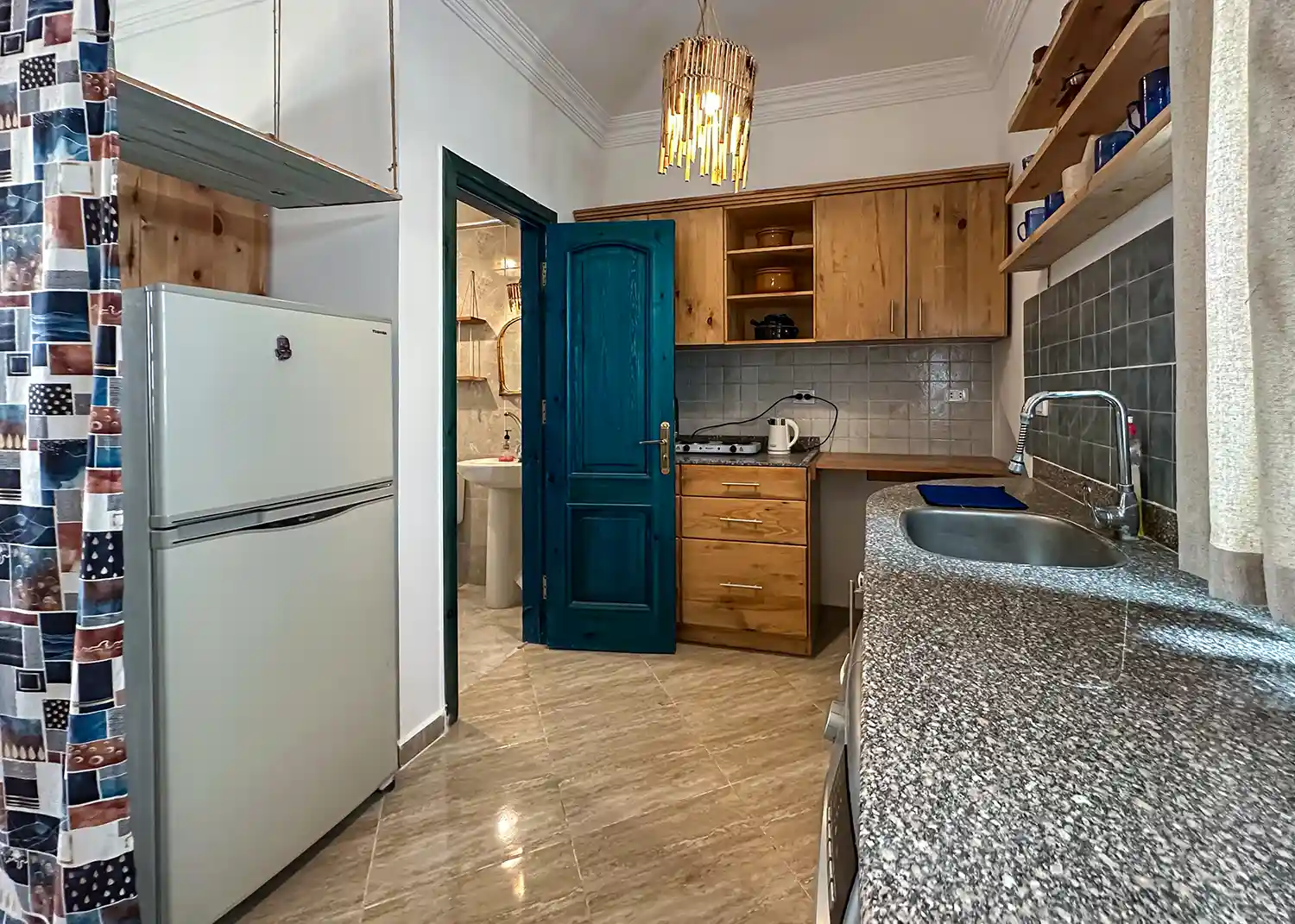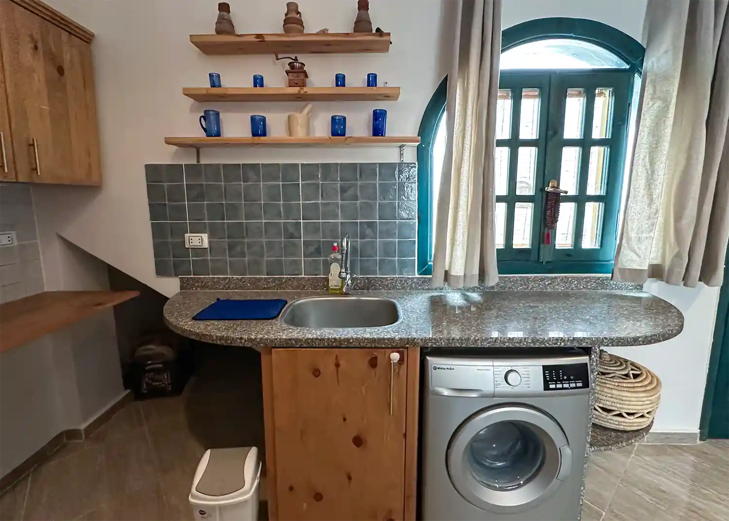 This sweet one bedroom apartment is thoughtfully decorated and has everything needed for a comfortable stay in Dahab including a 4 hob gas cooker, gas oven, washing machine, fridge freezer, kitchen basics and Ac’s in both the living space and the bedroom.