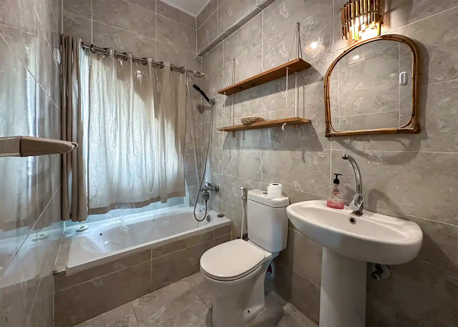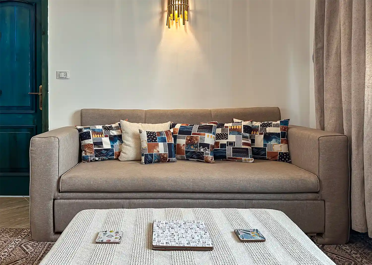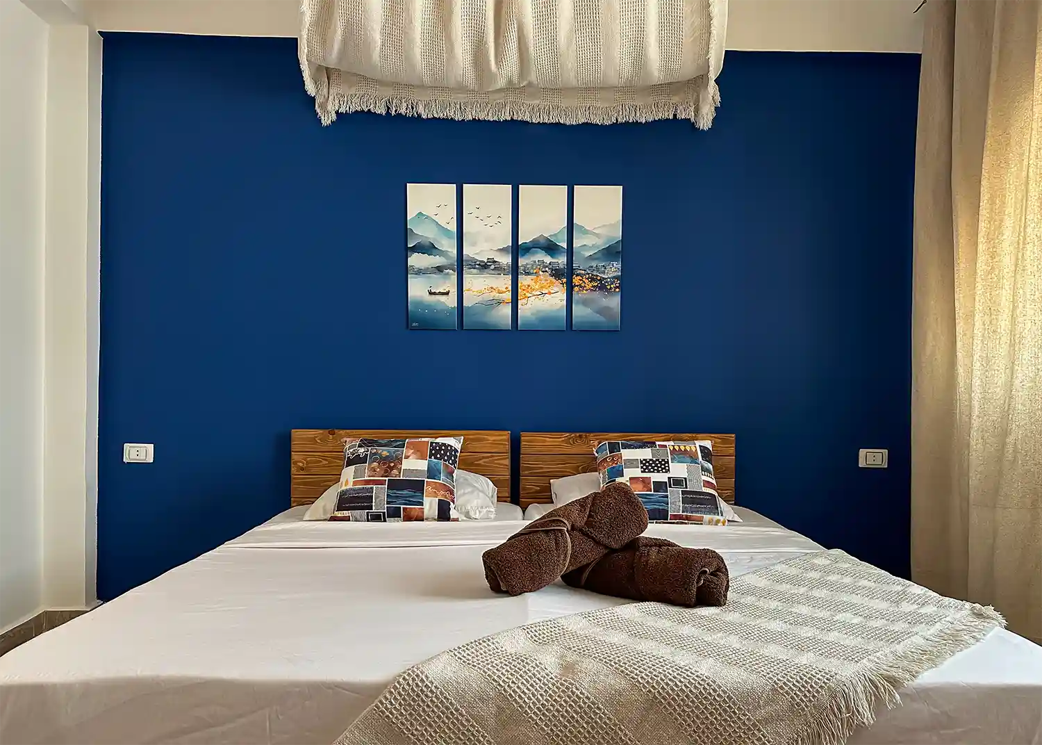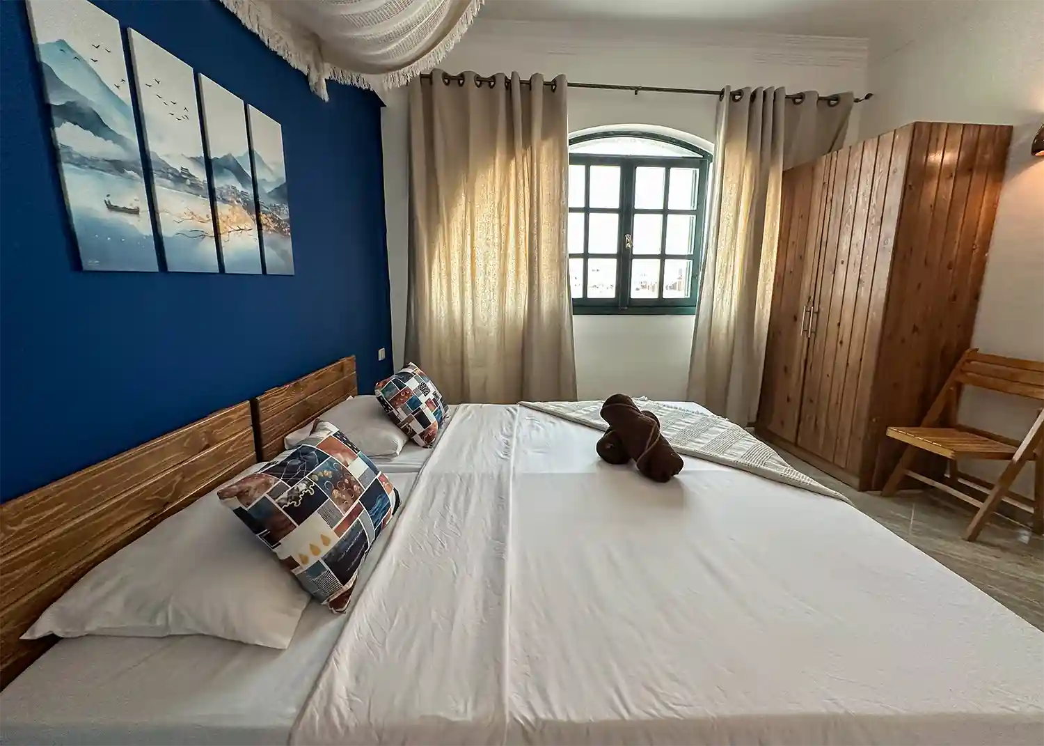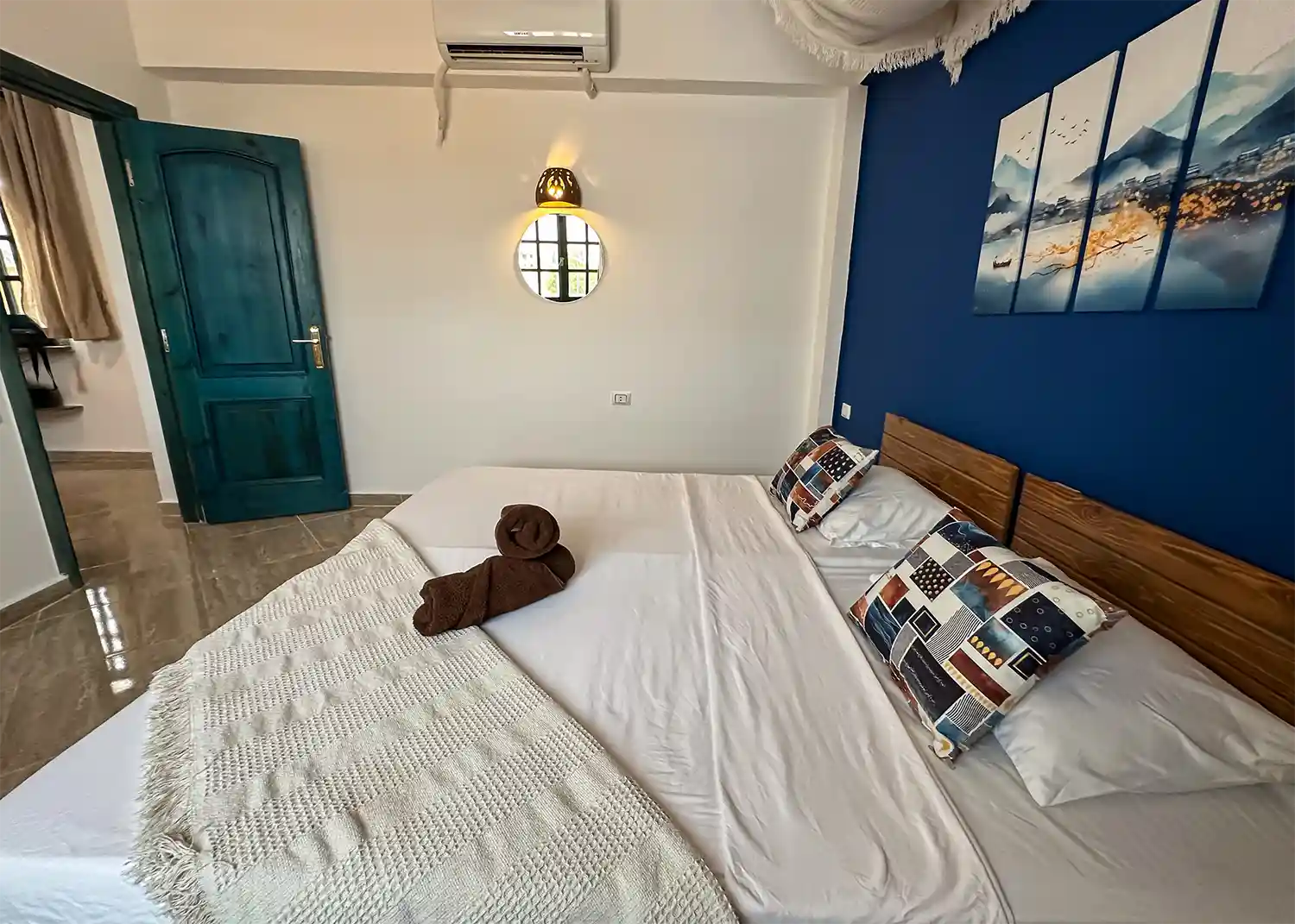 This sweet one bedroom apartment is thoughtfully decorated and has everything needed for a comfortable stay in Dahab including a 4 hob gas cooker, gas oven, washing machine, fridge freezer, kitchen basics and Ac’s in both the living space and the bedroom.